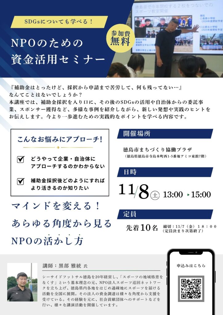 『補助金はとったけど、採択から申請まで苦労して、 何も残ってない…』 なんてことはないでしょうか? 本講座では、補助金採択を入り口に、 その後のSDGsの活用や自治体からの委託事業、 スポンサー獲得など、多様な事例を紹介しながら、 新しい発想や実践のヒントをお伝えします。 今より一歩進むための 実践的なポイントを学べる内容です。