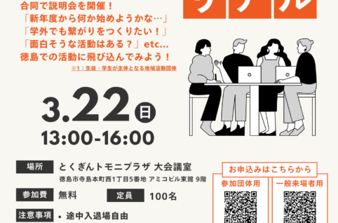 【日時】2026年3月22日(日)13:00~16:00 【場所】とくぎんトモニプラザ 大会議室(徳島市寺島本町西1丁目5番地 アミコビル東館 9階) 【対象】・徳島市で活動している活動の紹介や新メンバーの募集をしたい学...