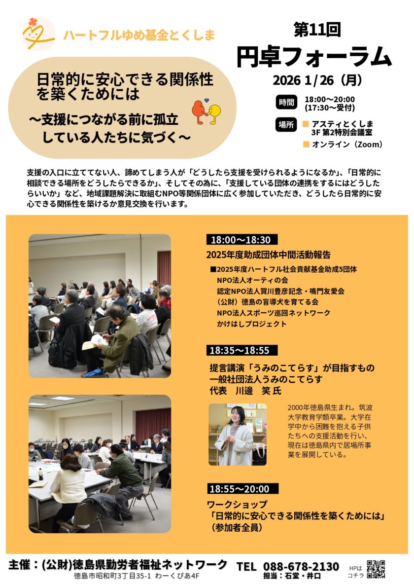 今回は、2025年度ハートフル社会貢献基金助成団体からの中間報告と「支援につながる前に孤立している人たちに気づき、日常的に安心できる関係性を築くためには」をテーマに、徳島県で居場所事業の支援活動を展開されている方の提言講演と共に、支援への取り組みを深めるためのワークショップを開催いたします。