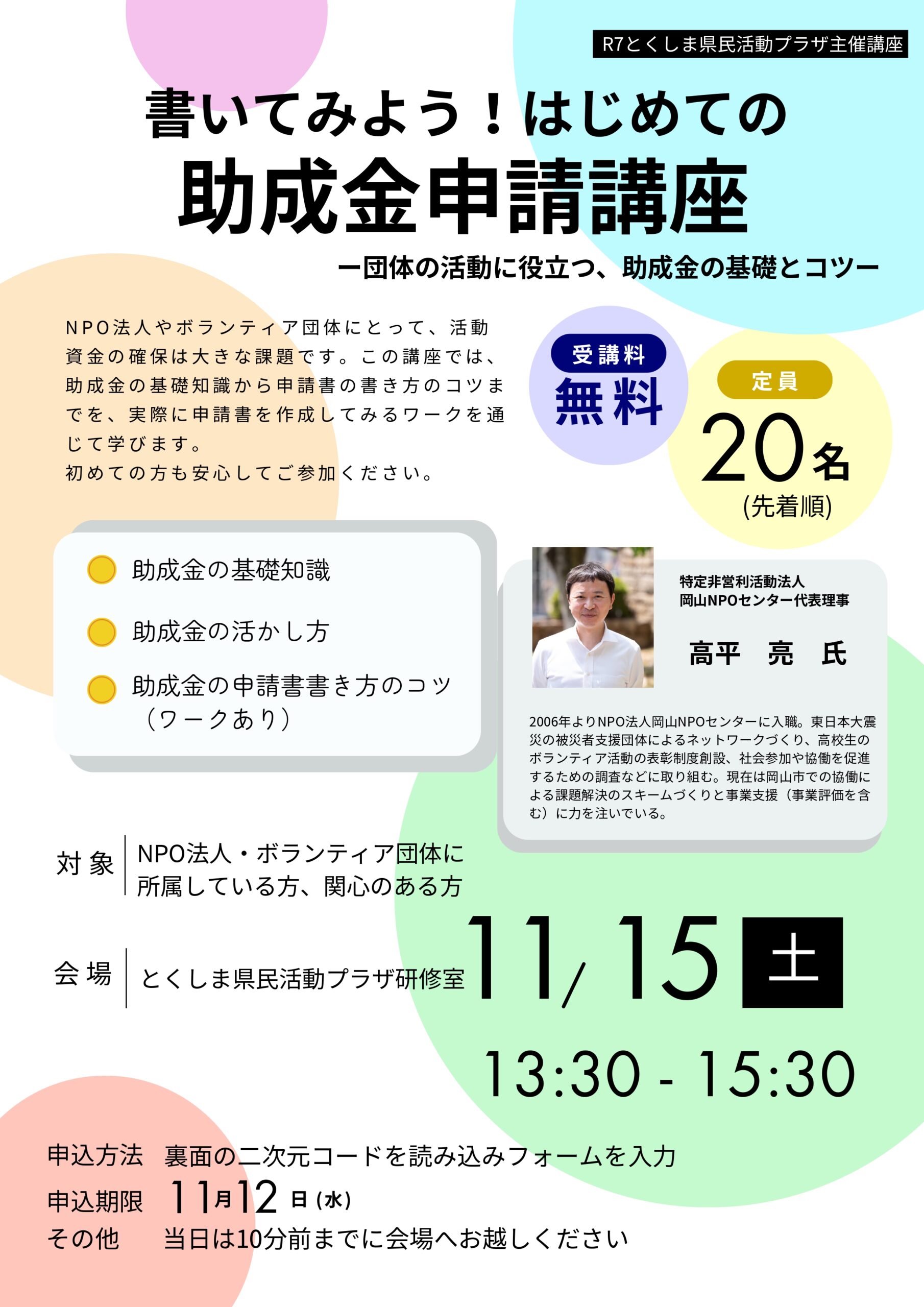 【NPO団体】講座・イベント情報 2022年5月11日 by machipla-wp みんなでエシカル 2025年10月15日2025年10月24日 【プログラム】 17:00 開会 17:10 第1部トークセ… 続きを読む 書いてみよう!はじめての助成金申請講座 2025年10月11日2025年10月25日 NPO法人やボランティア団体にとって、活動資金の確保は大きな… 続きを読む そなえランド〜あそびでまもる、ぼくらのミライ〜 2025年9月20日2025年9月25日 「防災」って聞くとちょっとむずかしそう。 「そなえランド… 続きを読む 【参加者募集】女性・若者活躍推進支援セミナー2025 2025年9月19日2025年9月24日 【内容】 就職・再就職への学びと自信を身につける女性・若者活… 続きを読む 【参加者募集】コミュニティビジネスセミナー2025 2025年9月4日2025年9月24日 【内容】 ・やりたいことがある人、何をどうやっていいかわから… 続きを読む NPOのための助成金説明会&相談会Ⅱ(R7年度プラザ主催講座) 2025年8月23日2025年9月25日 【内容】 団体にとって活動資金を集めることは大切なことですが… 続きを読む 「世界メンタルヘルスデー映画上映会プロジェクト2025/映画『悠優の君へ』無料上映会のお知らせ 2025年8月22日2025年8月23日 【関連URL】 https://cocoronobase.c… 続きを読む NPO法人設立・運営講座(R7年度県民活動プラザ主催講座) 2025年8月1日2025年8月23日 【内容】 団体の活動に合った組織をつくり活動の幅を広げたい、… 続きを読む 徳島「 」未来を描くプロジェクト 2025年7月30日2025年8月2日 未来の選択肢を広げる、特別な1日 ―自分の未来を描く、“リア… 続きを読む1 2 … 15 次へ →