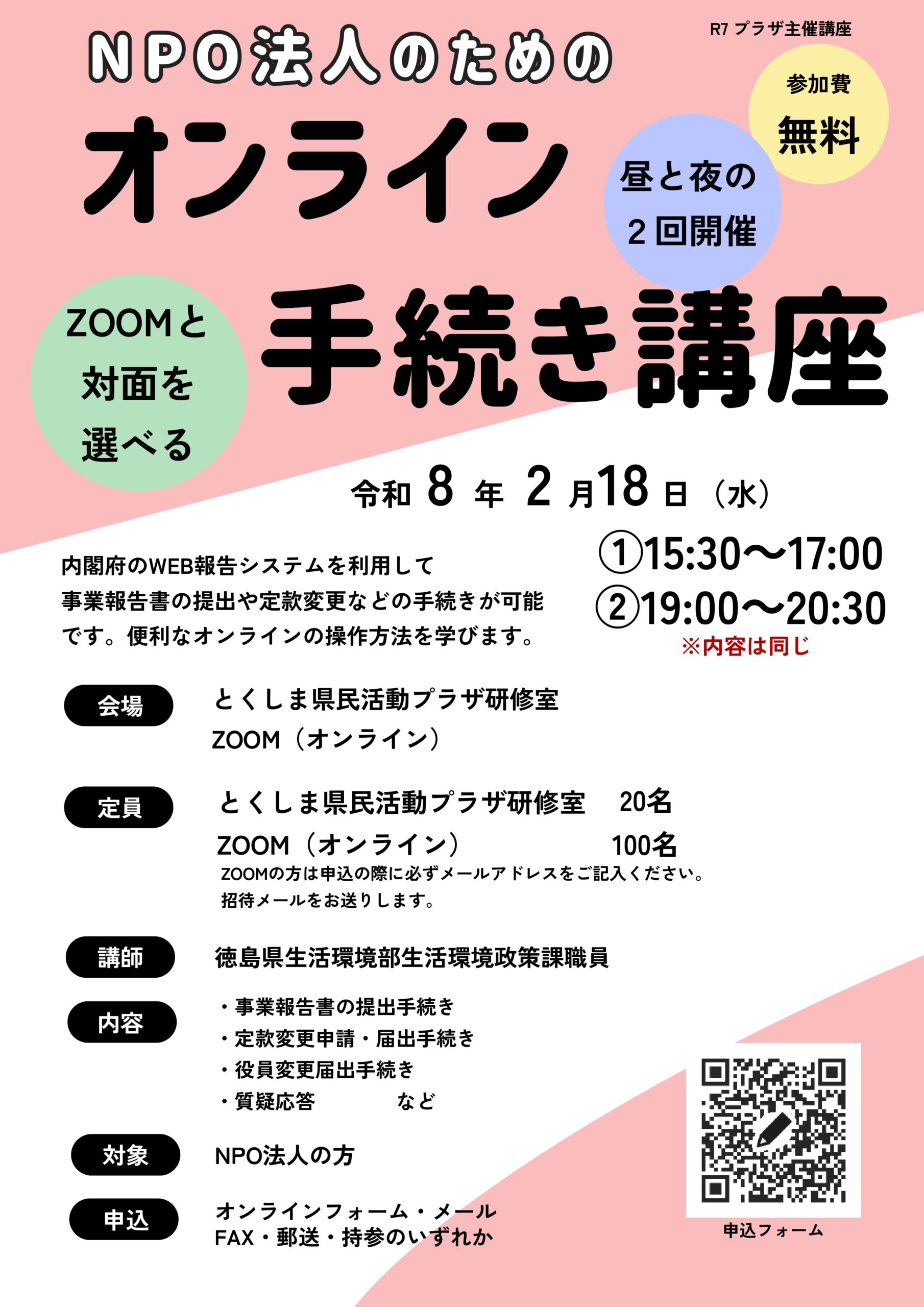 【NPO団体】講座・イベント情報 2022年5月11日 by machipla-wp 子どもへの暴力防止のための基礎講座 2026年1月31日 「こどもまんなか社会」を実現するには、何より当事者である子ど… 続きを読む NPO法人のための実践講座 スマホで撮るSNS用写真入門講座 2026年1月7日2026年1月16日 「自分のイメージした写真が撮れない…」「なんとなく、伝わる力… 続きを読む 映画「みんなの学校」に学ぶ子どもの力を引き出す対話術 2025年12月27日2026年1月31日 教育現場や家庭での子どもにとっての「安心できる場」づくりを、… 続きを読む NPO法人のためのオンライン手続き講座 2025年12月26日2026年1月16日 内閣府のWEB報告システムを利用して事業報告書の提出や定款変… 続きを読む NPO法人のための会計講座~中級編~ 2025年12月20日2026年1月16日 NPO法人を設立すると、毎度会計書類を作成し活動内容を公表す… 続きを読む ハートフルゆめ基金とくしま 第11回円卓フォーラム 2025年12月5日2025年12月5日 円卓フォーラムとは、地域のさまざまな担い手が、課題の情報を共… 続きを読む NPO法人のための会計講座~初級編~ 2025年11月21日2025年12月3日 NPO法人を設立すると、毎度会計書類を作成し活動内容を公表す… 続きを読む みんなでエシカル 2025年10月15日2025年10月24日 【プログラム】 17:00 開会 17:10 第1部トークセ… 続きを読む 書いてみよう!はじめての助成金申請講座 2025年10月11日2025年10月25日 NPO法人やボランティア団体にとって、活動資金の確保は大きな… 続きを読む1 2 … 16 次へ →
